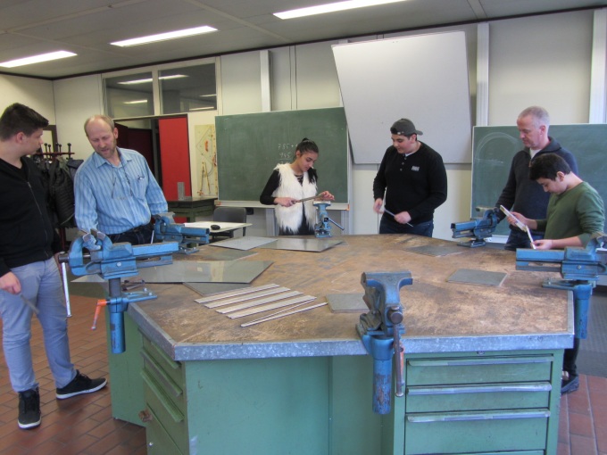Dabei lernten sie grundlegende Methoden des systematischen Konstruierens sowie Fertigungsverfahren aus dem Metallbereich wie Sägen, Scherschneiden, Bohren, Feilen, Schleifen und Schweißen intensiv kennen.
