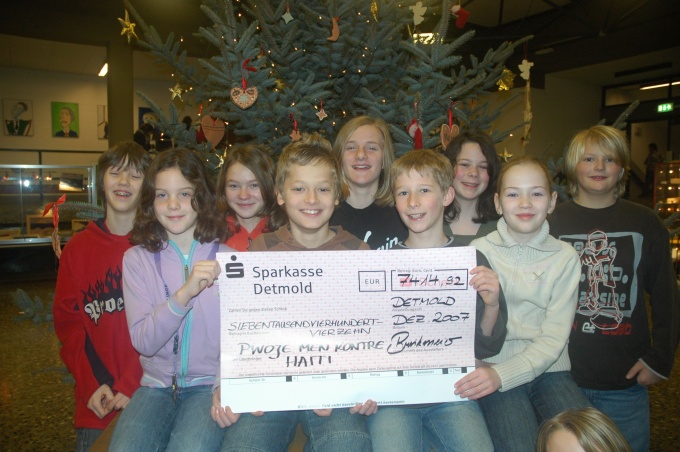 Am letzten Schultag vor den Weihnachtsferien überwies die Heinrich-Drake-Realschule Detmold den stolzen Betrag von 7414,92 Euro für das Haiti-Projekt. Die Sportklasse 5c (v.l. Jonas Jahn, Marina Busch, Karina Gießelmann, Justin Ernst, Fiona Klauck, Marvin Schmidt, Marlene Hildebrandt, Andrea Ohrimenko, Christopher Spahn) erwanderte den höchsten Betrag (2050 Euro)