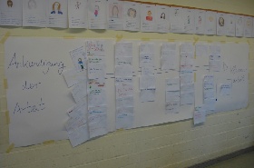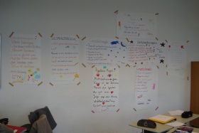 In Gruppenarbeit werden Gesprächsregeln erarbeitet, vorgestellt und als Wandplakate fixiert. |