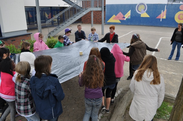 Aufgabe für die 6a: Wie transportieren wir gemeinsam einen Becher mit Wasser auf einer Plane ohne etwas zu verschütten?