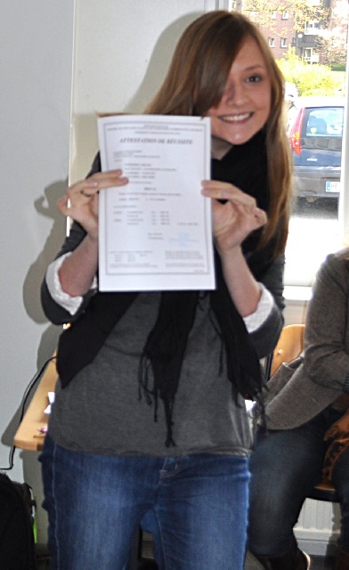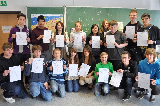 In vier Teilbereichen mussten die Schülerinnen und Schüler ihre Kenntnisse und Fähigkeiten im Französischen unter Beweis stellen. Die größte Herausforderung stellte dabei sicherlich die mündliche Prüfung im Beisein von Muttersprachlern dar. Viele Schülerinnen und Schüler erlebten zum ersten Mal eine fremdsprachliche Prüfungssituation, entsprechend groß war die Nervosität. Aber alle Absolventen kamen mit einem strahlenden Lächeln aus der Prüfung, und so konnten 18 Schülerinnen und Schüler ihr Diplom aus den Händen von Schulleiterin Eva Brinkmeier erhalten.