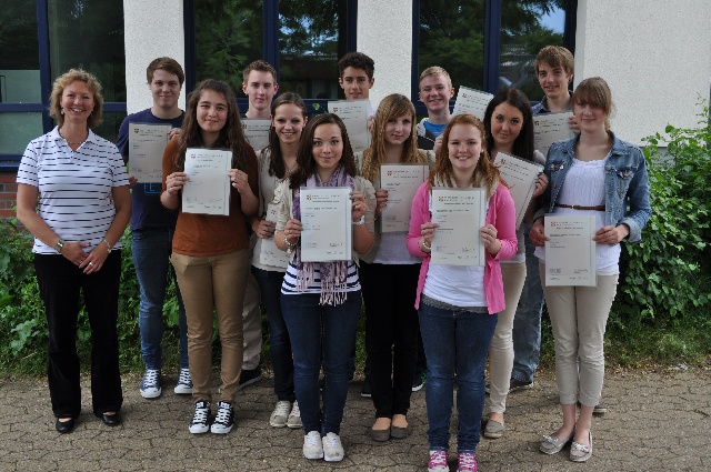 Gut vorbereitet durch Konrektorin Bianca Gehler - in freiwilligem Nachmittagsunterricht - stellten die Prüflinge in den Teilbereichen Sprechen, Hören, Wortschatz und Schreiben ihre Fähigkeiten unter Beweis. Nach (gefühlt ewiger) Wartezeit kam das das freudige Ergebnis: alle haben bestanden und können sich über ein nicht nur optisch schönes, sondern auch international anerkanntes Zertifikat freuen.