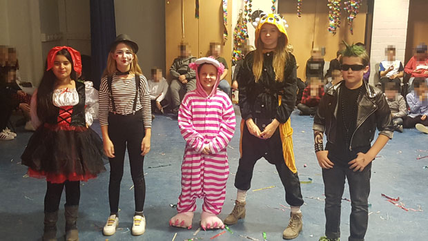 Unser Foto zeigt Vina Kurt, Laura Friesen (5a), Alina Walter (6d), Alicia Wenzel (6b) und Jeremia Ismailov (6d) mit ihren phantasievollen Kostümen.