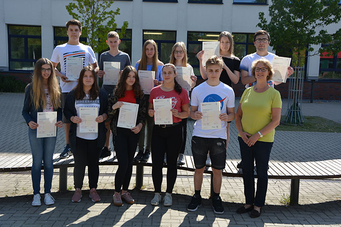 Foto: (von links) Melvin Kohlbrock, Nico Penkalla, Jolina Adrian, Jacqueline Adrian, Veronique Derksen, Sipan At (obere Reihe), Selina Stahnke, Emily O'Neill, Sina Schniedermann, Stefanie Biel, Daniel Gramlich, Lehrerin Bianka Gehler (untere Reihe). Auf dem Bild fehlt Julian Brandt.