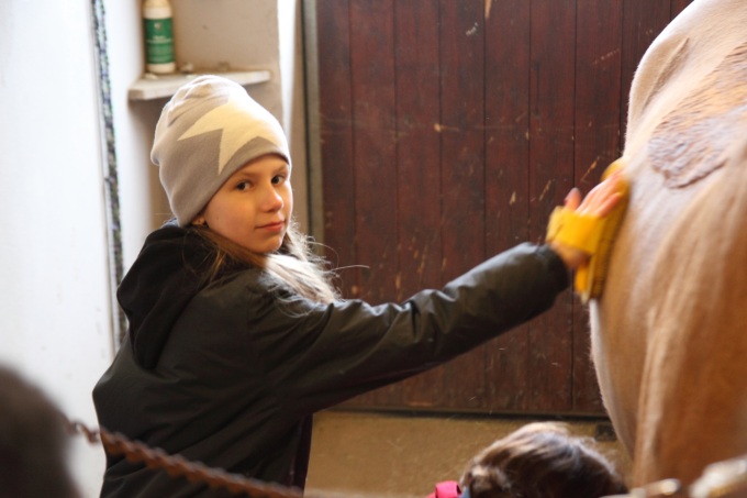Nach dem ersten Fragenhagel ging es endlich zu Dinera in die Box. Der ersten Reaktion der Schüler ("Ist die süß!") folgte vorsichtige Kontaktaufnahme. Nach dem Bekanntmachen wurde "Dini" zum Putzplatz geführt. Wer sich traute, durfte die kleine Stute striegeln und die Hufe auskratzen.