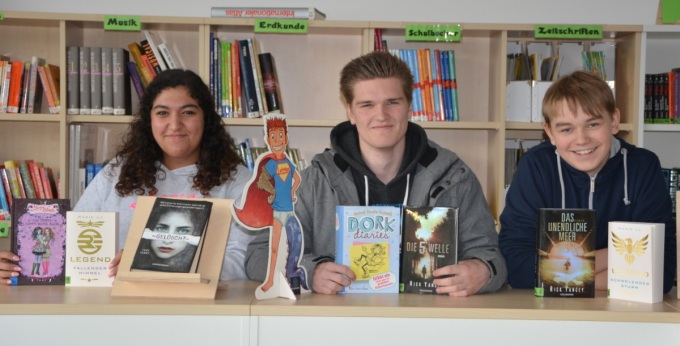 Rengin Agin, Felix Pawlick und Hannes Schäffer vom Bücherei-Team präsentieren eine Auswahl der Neuanschaffungen.