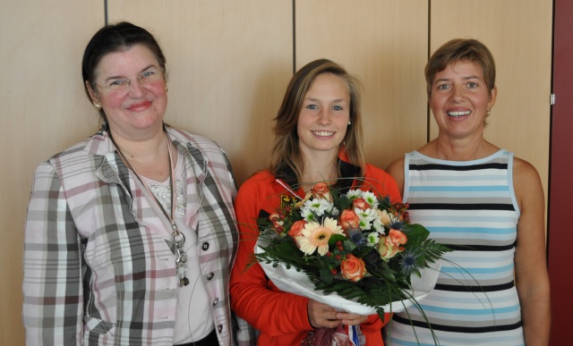 Schulleiterin Eva Brinkmeier und Klassenlehrerin Annett Urbainczyk freuen sich mit Desiree Singh über ihren Doppelerfolg.