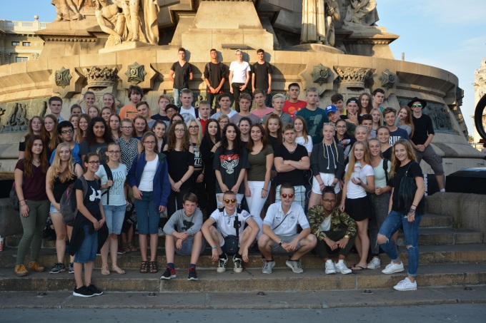 Die Klassen 10a,b und c vor der Kolumbussäule in Barcelona.